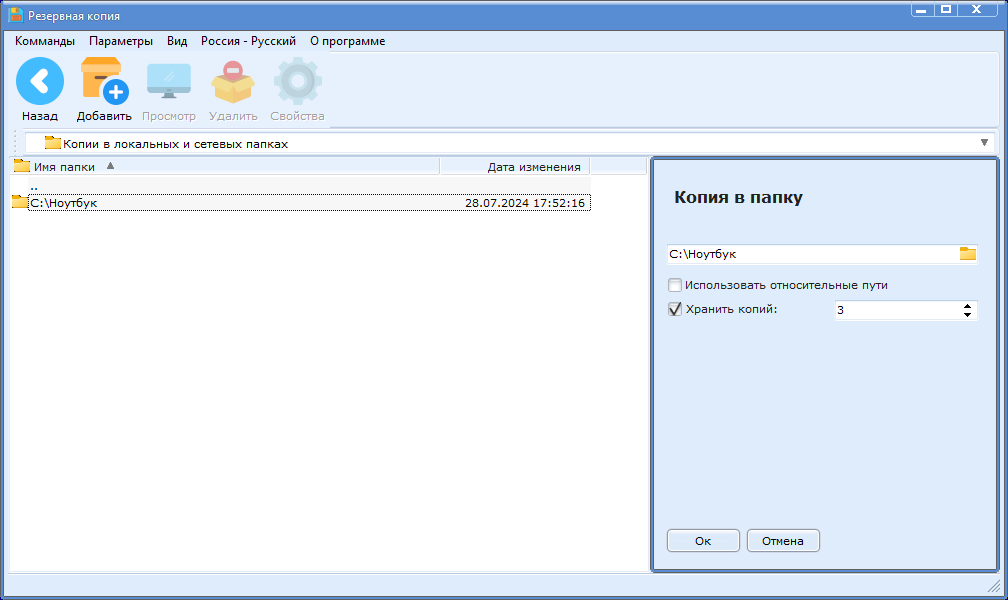 в форме отображаются локальные и сетевые папки, в которые будут скопированы резервируемые файлы. В свойствах папки можно указать количество самых свежих копий, которые будут хранится.