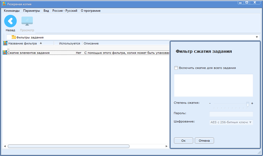 Во время копирования файлов к заданию может быть применен фильтр сжатия. Можно установить описание, степень сжатия и пароль для архива.